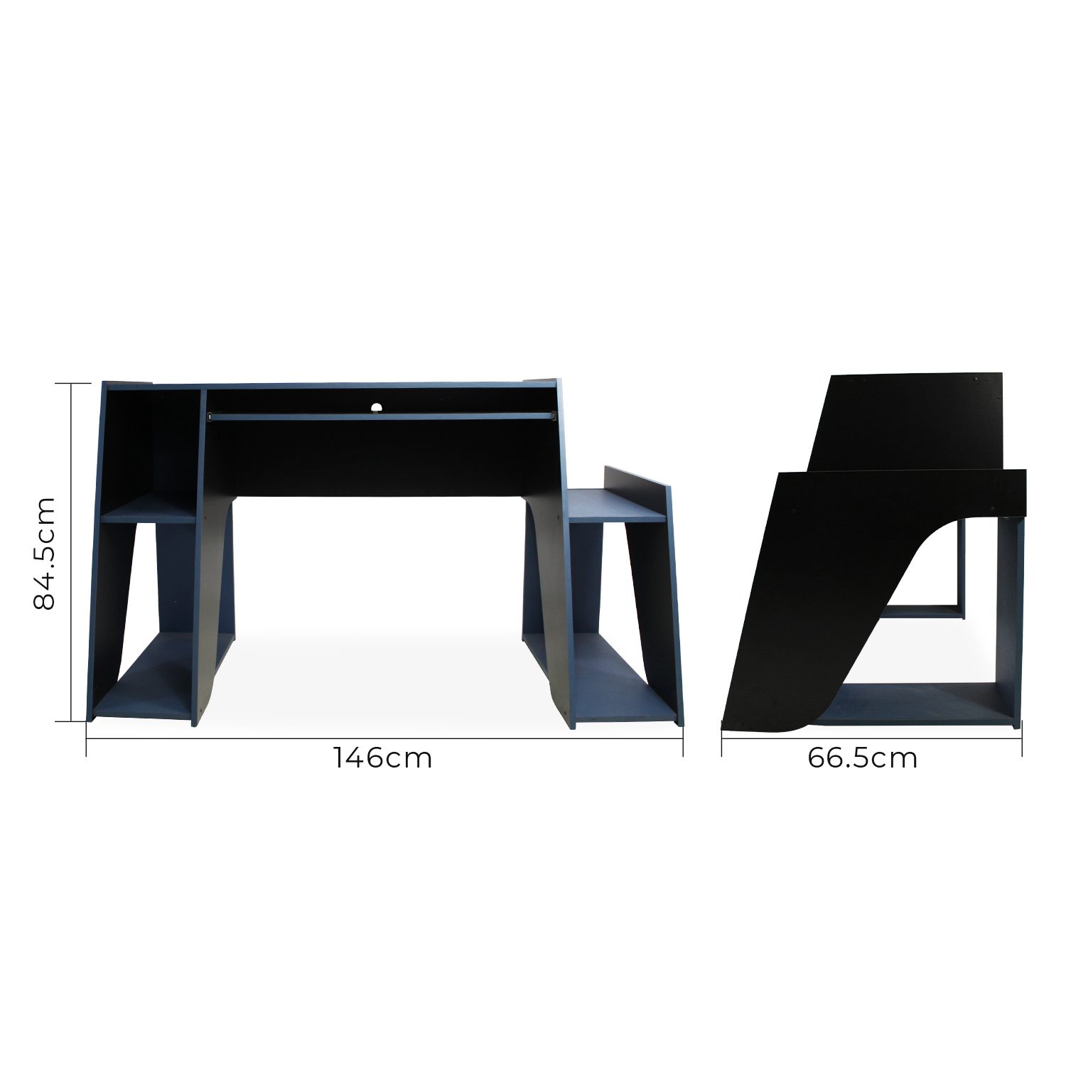 - DISEÑO PRÁCTICO Y ESPACIOSO: Con 146 centímetros en total de largo, 66.5 de ancho y 84.5 de alto, cuenta con suficiente espacio para 2 monitores, además de múltiples repisas para colocar los gadgets de tu estación gamer, así como libros, libretas, juegos y consolas